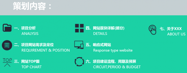 一般我們?cè)诤涂蛻粽劸W(wǎng)站開發(fā)建設(shè)項(xiàng)目的時(shí)候,對(duì)方通常都會(huì)要求我們提供一份網(wǎng)站開發(fā)建設(shè)方案。固然在項(xiàng)目接洽過(guò)程中有談到某些開發(fā)建設(shè)方面的內(nèi)容,但是一份書面的方案提供仍是很有必要的。這不僅利便于客戶更加仔細(xì)地了解我們提供的服務(wù)和開發(fā)建設(shè)流程,還有利于客戶治理層之間的項(xiàng)目溝通探討,為雙方之間的項(xiàng)目確定提供指導(dǎo)性文件。常見的方案都是以PPT形式展現(xiàn)的,PPT的好處就是展現(xiàn)形式豐碩多樣,給人的感覺(jué)直觀且信息量大,易于理解。PPT方案也可采用某些動(dòng)效展示,令某些動(dòng)作交互更加通俗易懂,客戶在閱覽過(guò)后心里也更加清晰明白。假如項(xiàng)目不大,當(dāng)然也可以使用WORD來(lái)展示,不外小編仍是推薦以PPT形式來(lái)展現(xiàn),究竟顯得高端一點(diǎn)。 針對(duì)不同的項(xiàng)目需求有不同的策劃方案,我們做出來(lái)的方案一定要貼和客戶需求來(lái)編寫,時(shí)刻捉住客戶所需,才能令這篇方案體現(xiàn)應(yīng)有的價(jià)值,而不是抄襲千篇一律的模式。沒(méi)有重點(diǎn)的方案,只會(huì)令客戶感到疑惑,得不到客戶想得到的信息,那么繼承的合作也就難以開展下去。 下面讓我們來(lái)看看詳細(xì)從何著手來(lái)寫一篇優(yōu)質(zhì)的網(wǎng)站建設(shè)策劃方案。 一、預(yù)備工作 俗話說(shuō)兵馬未動(dòng),糧草先行。我們?cè)陂_始進(jìn)行方案策劃的時(shí)候,一定要提前做好預(yù)備工作。詳細(xì)說(shuō)來(lái)就是把握客戶具體資料,包括客戶所屬行業(yè)特點(diǎn)、網(wǎng)站建設(shè)的需求、客戶對(duì)互聯(lián)網(wǎng)的認(rèn)知度等(利便方案的策劃是否要運(yùn)用專業(yè)術(shù)語(yǔ)仍是淺顯易懂的方式來(lái)編寫)。當(dāng)我們知曉這些內(nèi)容后,就可以思量接下來(lái)的方案編寫采取哪種形式來(lái)展現(xiàn)好。再者,也能讓我們的方案內(nèi)容策劃盡可能地貼近客戶、貼近需求。這一階段的預(yù)備工作是我們必需要做的,除此之外我們還要和公司技術(shù)等相關(guān)職員研討一下針對(duì)客戶的建站要求詳細(xì)是怎么部署的。我們策劃職員的角色就相稱于連接二者的橋梁,當(dāng)然要知曉雙方的信息,這樣策劃出來(lái)的方案才能合用于雙方。方案不只是客戶要看,我們內(nèi)部也要參閱的,這點(diǎn)大家需要留意。 這里順便談一點(diǎn),就是PPT要不要使用模板的題目,小編覺(jué)得使用模板沒(méi)什么不好,當(dāng)然假如能自己設(shè)計(jì)那是最好的。使用現(xiàn)成的PPT,保持版式的條件下修改里面的內(nèi)容,這是一種快速完成方案的方法。假如自己設(shè)計(jì),那么有更多的發(fā)展空間,良多圖片設(shè)計(jì)也能自定義化,適合擁有一定設(shè)計(jì)基礎(chǔ)的策劃者。自己完全獨(dú)立設(shè)計(jì)一篇策劃方案PPT,打從心里也是對(duì)自己的肯定和鼓勵(lì)。所以不用糾結(jié)用了別人的PPT模板,里面的內(nèi)容才是實(shí)質(zhì)性的干貨,是別人復(fù)制不到的精華。 二、策劃方案的編寫 開始編寫策劃方案之前,最好先列個(gè)提綱、打個(gè)草稿,就比如我們寫作文一樣。想好先寫什么、再寫什么,做到心中有數(shù),這樣編寫的方案也有一定的條理順序,便于閱讀理解。下面浪訊科技小編將自己平時(shí)的策劃步驟給大家分享一下,包括以下幾點(diǎn)。 1.首頁(yè)展示 策劃案的名稱,策劃案編寫者所屬公司等信息,可適當(dāng)添加。不要求信息量有多大,簡(jiǎn)潔明了就好。如下圖,當(dāng)然配色那些可以按照客戶行業(yè)特征或以科技公司色調(diào)為主,不要太花哨就好。 2.策劃內(nèi)容 這部門展示我們針對(duì)客戶需求所進(jìn)行的大體規(guī)劃,常見的內(nèi)容包括項(xiàng)目分析、網(wǎng)站需求及定位、網(wǎng)站TOP圖、板塊詳解、響應(yīng)式網(wǎng)站特色、項(xiàng)目建設(shè)流程周期及預(yù)算、關(guān)于我們等。詳見下圖