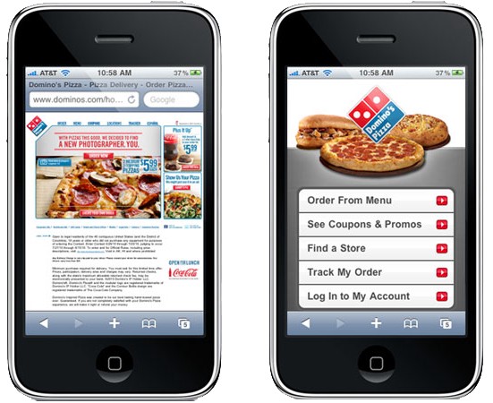 假如你但愿自己的網(wǎng)站能夠輕松的在移動端設備上訪問,那么應當消除所有移動端上可能存在的可用性的題目,下面有12條晉升移動端網(wǎng)頁設計的建議,確保你的頁面能夠通過 可用性測試,并提供良好的用戶體驗。 1、針對移動端進行全面優(yōu)化 桌面端網(wǎng)頁在移動端設備上首要的障礙就是導航的使用?纯聪旅鍰omino批薩的案例,它的桌面端和移動端網(wǎng)頁的對比就相稱顯著,移動端頁面經(jīng)由優(yōu)化之后的體驗就完全不同。簡樸說來,優(yōu)化后的移動端頁面更加干凈,有著更輕易導航的CTA按鈕