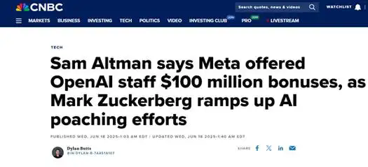 6 月 21 日消息,OpenAI 首席執(zhí)行官薩姆・奧爾特曼(Sam Altman)周三表示,Meta 曾向某 OpenAI 員工開出 1 億美元(現(xiàn)匯率約合 7.18 億元人民幣)獎(jiǎng)金來挖人,但未能成功。事件核心解讀
