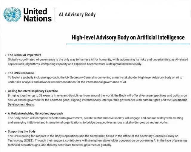 聯(lián)合國成立39人咨詢顧問團隊以解決人工智能國際治理問題。 聯(lián)合國成立了一個由39人組成的咨詢顧問團隊,以解決人工智能國際治理問題。該團隊由來自世界各地的專家組成,