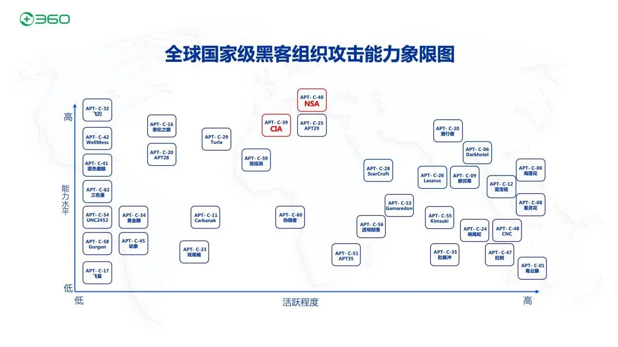 9月8日電 9月8日,三六零(601360.SH,下稱“360”)公司發(fā)布全球首個國家級黑客安排進犯才能象限圖,從才能水平緩活躍程度兩個維度,