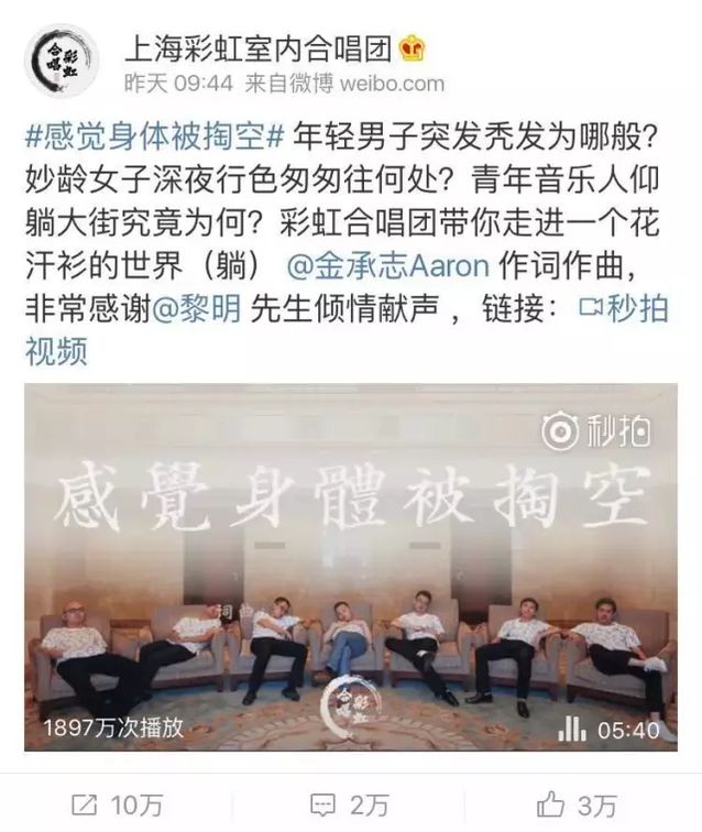 昨天一整天,榜妹的朋友圈都被一首神曲刷屏了。歌名很污,叫《感覺身體被掏空》。在好奇心的驅(qū)使下榜妹聽完了,沒想到,其實太魔性,于是背著老板聽了一遍又一遍。 假如你還沒有聽,趕快戳下方視頻! 聽完你一定會轉(zhuǎn)發(fā)的 不得不說,這首神曲又將成為霸占輿論高地的一枚爆款。而這首神曲的背后創(chuàng)作團隊——上海彩虹室內(nèi)合唱團, 這次是如何在短時間內(nèi)打造出爆款神曲的呢? 昨天上午9點40分左右,“上海彩虹室內(nèi)合唱團”推送了一篇《“汪汪汪!汪汪汪汪汪汪汪汪!”》的文章,其中插入了這首《感覺身體被掏空》的短視頻。與此同時,其官方微博也發(fā)布了該視頻,并配文“年青男子突發(fā)禿發(fā)為哪般?妙齡女子深夜形色匆匆往何處?青年音樂人仰躺大街畢竟為何?” 發(fā)布八小時后,公家號文章迅速破10w+,并且在當(dāng)晚11點,該視頻在秒拍的播放數(shù)達(dá)到1111萬。 截至到今天下戰(zhàn)書14點30分,這篇《“汪汪汪!汪汪汪汪汪汪汪汪!”》閱讀達(dá)到14萬,后臺粉絲增長13000。 @上海彩虹室內(nèi)合唱團 發(fā)布的這條微博閱讀達(dá)到1796萬,轉(zhuǎn)評12萬,點贊3萬。意外之喜是,僅僅一天的時間,微博的粉絲就從原先的1.5萬增長至7.5萬,凈增6萬粉絲,秒拍上的視頻播放量也達(dá)到了1842萬。