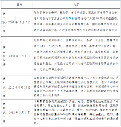 2月25日,國家體育總局發(fā)布《體育總局關(guān)于切實(shí)落實(shí)彩票資金專項(xiàng)審計(jì)意見加強(qiáng)體育彩票治理工作的通知》,受該通知的影響,部門省級彩票治理中央從2015年2月25日起暫停接受互聯(lián)網(wǎng)彩票銷售訂單,公司無紙化彩票代購業(yè)務(wù)從2015年2月25日開始暫時休止,詳細(xì)恢復(fù)時間待定。 2月25日,國家體育總局發(fā)布《體育總局關(guān)于切實(shí)落實(shí)彩票資金專項(xiàng)審計(jì)意見加強(qiáng)體育彩票治理工作的通知》,受該通知以及財(cái)政部、民政部和體育總局聯(lián)合下發(fā)的《關(guān)于開展擅自利用互聯(lián)網(wǎng)銷售彩票行為自查自糾工作有關(guān)題目的通知》的影響,部門省級彩票治理中央從2015年2月25日起暫停接受互聯(lián)網(wǎng)彩票銷售訂單,公司無紙化彩票代購業(yè)務(wù)從2015年2月25日開始暫時休止,詳細(xì)恢復(fù)時間待定。 對于涉及互聯(lián)網(wǎng)彩票業(yè)務(wù)的上市公司來說,受《通知》影響,我國唯逐一個在美國納斯達(dá)克上市的互聯(lián)網(wǎng)彩票銷售概念股“500彩票網(wǎng)”股價單日暴跌22.37%,盤中最低到達(dá)9.55美元,已不足歷史最高價的五分之一。繼500彩票網(wǎng)停售4種高頻彩后,阿里、騰訊、人民網(wǎng)旗下互聯(lián)網(wǎng)售彩平臺也接踵公布暫停全部或部門彩種的銷售。