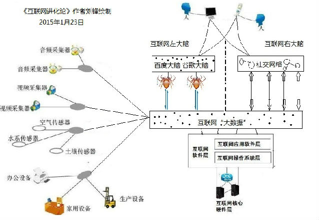 4.2014年繪制出“互聯(lián)網(wǎng)大腦的左右大腦結(jié)構(gòu)圖”,提出以搜索引擎為出發(fā)點(diǎn)的百度大腦,谷歌大腦等互聯(lián)網(wǎng)人工智能系統(tǒng)將進(jìn)化成為互聯(lián)網(wǎng)的左大腦,以Facebook,QQ,微信為代表的社交網(wǎng)絡(luò)正在形成互聯(lián)網(wǎng)的右大腦.“