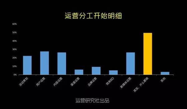 不外從16年運營人生存現(xiàn)狀調查的結果中我看到了一個好的趨勢:運營分工開始明細。內容和用戶運營的相關從業(yè)者比例晉升到了26%,新媒體運營的比例在下降,越來越多的企業(yè)開始意識到對產(chǎn)品本身運營的價值高過在新媒體渠道的盲目跟進。