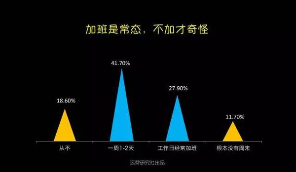 超過81.4%的運營需要加班,更糟糕的是有11.7%的從業(yè)者根本就沒有周末。拼一點的創(chuàng)業(yè)公司正常的作息時間是“10-10-6”,也就是每周需要工作6天,周末碰到產(chǎn)品或者流動上線基本上就是繼承加班了。