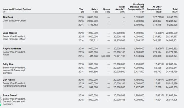 SEC(美國證券交易委員會)表露的蘋果公司文件顯示,蘋果公司CEO Tim Cook(蒂姆·庫克)2014財年薪酬總額為922萬美元,是其2013財年薪酬(430萬美元)的2.1倍,其中包括工資174萬美元,非股權(quán)激勵薪酬670萬美元。研究每年詳細(xì)的數(shù)據(jù)可知庫克每年的基本薪酬是在增長的,分別從2014年的174萬美元,2015年的200萬美元到2016年的300萬美元,確定庫克基本薪酬的就是蘋果公司薪酬委員會,這個委員會也決定所有其他高管的薪酬。