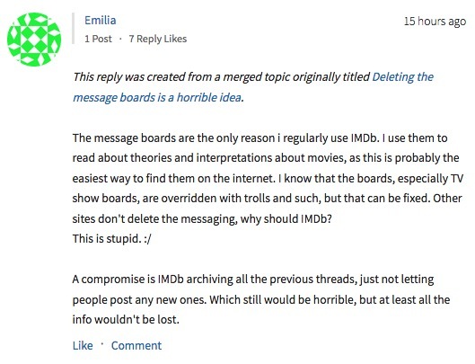 在 IMDb 的討論區(qū)中,動靜一宣布,不少用戶都跟帖表示對該決定的反對,并以為社交賬號并不可替換原留言板的功能。