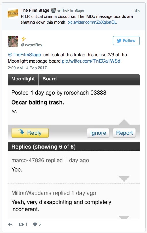 與這些“鐵桿粉絲”相反的是,不少外媒對 IMDb 這一舉措表示支持。TechCrunch 直接將 IMDb 的留言板欄目稱為“互聯(lián)網里其中一個最為糟糕的評論區(qū)”,并將其討論質量低下歸咎于網站的治理不當,導致留言板充斥著毫無意義且具有仇恨性的評論。