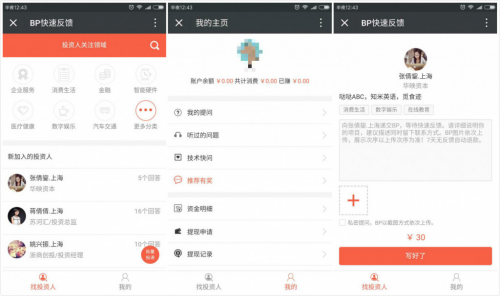 第2次轉(zhuǎn)型,聚份子將形式做得更輕,全部項目的中心業(yè)務(wù)環(huán)繞BP付費(fèi)投遞,做創(chuàng)投界的“分答”。出資人在渠道上自行定制發(fā)問報價,創(chuàng)業(yè)者上載自個的BP,向心儀的出資人付費(fèi)發(fā)問,這么一方面假如出資人看到并不是太符合要求的項目也有有些的時刻補(bǔ)償,一起創(chuàng)業(yè)者也能夠經(jīng)過自動投遞迅速取得出資反應(yīng)。別的感興趣的“圍觀大眾”還能夠挑選“偷聽”,低本錢學(xué)習(xí)出資人對項目的判別及看法。經(jīng)過這種方式,聚份子一個月內(nèi)就協(xié)助30多個項目迅速地找到意向的出資組織,最快的耗時不到10分鐘。并且在這30幾個項目中,很多的是對本來傳統(tǒng)項目進(jìn)行改造的二三線城市創(chuàng)業(yè)者,遍及現(xiàn)階段都有數(shù)百萬乃至千萬的流水,而這些項目是本來的投融資渠道效勞不到的。