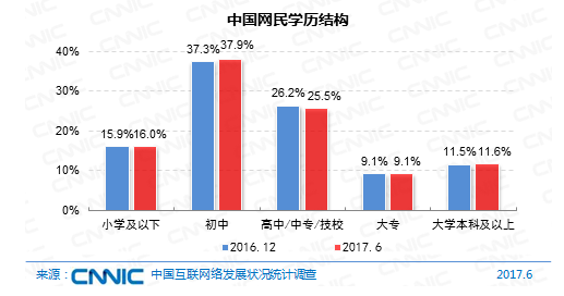 在學(xué)歷構(gòu)成上,我國(guó)網(wǎng)民依然以中等學(xué)歷集體為主,初中、高中/中專/技校學(xué)歷的網(wǎng)民占比別離為37.9%、25.5%。與2016年末比較,網(wǎng)民的學(xué)歷結(jié)構(gòu)改變不大。