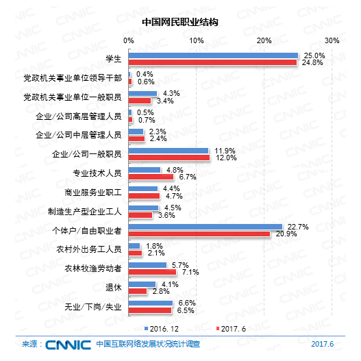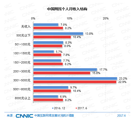 在收入結(jié)構(gòu)上,網(wǎng)民中月收入在2001-3000元及3001-5000元的集體占比較高,別離為15.8%和22.9%。較2016年末,收入在5000元以上的網(wǎng)民人群占比提高了2.1個(gè)百分點(diǎn)。