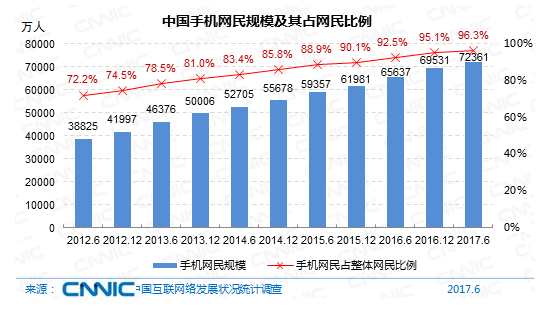 到2017年6月,我國(guó)手機(jī)網(wǎng)民規(guī)劃達(dá)7.24億,較2016年末添加2830萬(wàn)人。網(wǎng)民運(yùn)用手機(jī)上網(wǎng)的份額由2016年末的95.1%提高至96.3%。