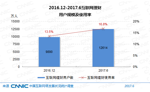 到2017年6月,我國(guó)購(gòu)買互聯(lián)網(wǎng)理財(cái)產(chǎn)品的網(wǎng)民規(guī)劃到達(dá)1.26億,較2016年末添加用戶2724萬(wàn)人,網(wǎng)民運(yùn)用率從13.5%升至16.8%。