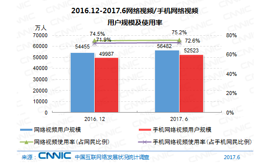 到2017年6月,我國(guó)網(wǎng)絡(luò)視頻用戶規(guī)劃達(dá)5.65億,較2016年末添加2026萬(wàn)人,添加率為3.7%;網(wǎng)絡(luò)視頻用戶運(yùn)用率為75.2%,較2016年末提高0.7個(gè)百分點(diǎn)。其間,手機(jī)視頻用戶規(guī)劃為5.25億,與2016年末比較添加2536萬(wàn)人,添加率為5.1%;手機(jī)網(wǎng)絡(luò)視頻運(yùn)用率為72.6%,比較2016年末添加0.7個(gè)百分點(diǎn)。