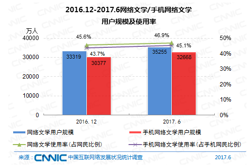 到2017年6月,網(wǎng)絡(luò)文學(xué)用戶規(guī)劃到達(dá)3.53億,較去年末添加1936萬(wàn),占網(wǎng)民全體的46.9%,其間手機(jī)網(wǎng)絡(luò)文學(xué)用戶規(guī)劃為3.27億,較去年末添加2291萬(wàn),占手機(jī)網(wǎng)民的45.1%。