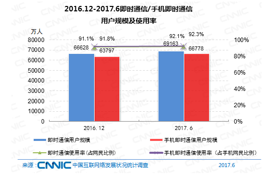 到2017年6月,即時(shí)通訊用戶規(guī)劃到達(dá)6.92億,較2016年末添加2535萬(wàn),占網(wǎng)民全體的92.1%。其間手機(jī)即時(shí)通訊用戶6.68億,較2016年末添加2981萬(wàn),占手機(jī)網(wǎng)民的92.3%。