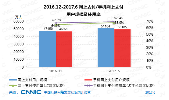 到2017年6月,我國(guó)運(yùn)用網(wǎng)上付出的用戶規(guī)劃到達(dá)5.11億,較2016年12月,網(wǎng)上付出用戶添加3654萬(wàn)人,半年添加率為7.7%,我國(guó)網(wǎng)民運(yùn)用網(wǎng)上付出的份額從64.9%提高至68.0%。其間,手機(jī)付出用戶規(guī)劃添加迅速,到達(dá)5.02億,半年添加率為7.0%,網(wǎng)民手機(jī)網(wǎng)上付出的運(yùn)用份額由67.5%提高至69.4%。
