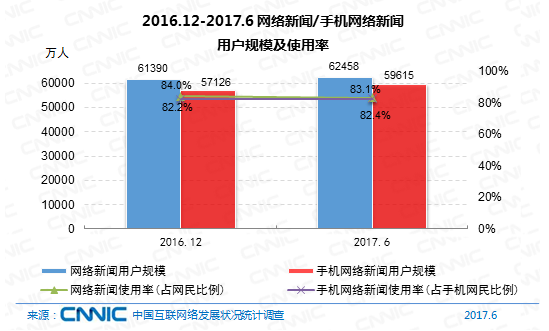 到2017年6月,我國(guó)網(wǎng)絡(luò)新聞?dòng)脩粢?guī)劃為6.25億,半年添加率為1.7%,網(wǎng)民運(yùn)用份額為83.1%。其間,手機(jī)網(wǎng)絡(luò)新聞?dòng)脩粢?guī)劃到達(dá)5.96億,占手機(jī)網(wǎng)民的82.4%,半年添加率為4.4%。