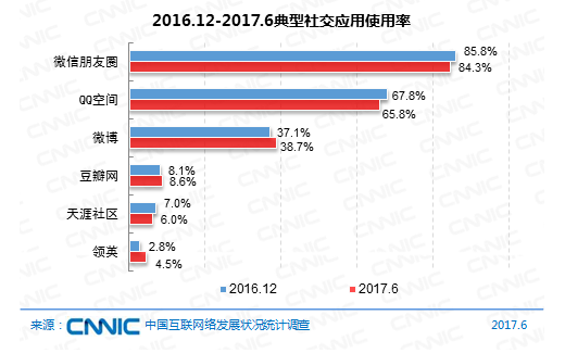到2017年6月,運(yùn)用率排名前三的交際運(yùn)用均歸于綜合類交際運(yùn)用。微信朋友圈、QQ空間用戶運(yùn)用率別離為84.3%和65.8%;微博用戶運(yùn)用率繼續(xù)回升,達(dá)38.7%,較2016年12月上升1.6個(gè)百分點(diǎn)。筆直類交際運(yùn)用中,豆瓣用戶運(yùn)用率為8.6%。