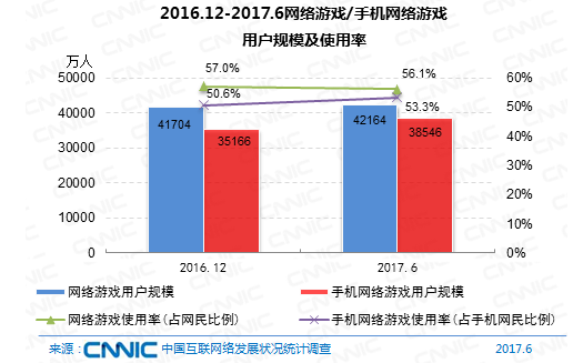 到2017年6月,我國(guó)網(wǎng)絡(luò)游戲用戶規(guī)劃到達(dá)4.22億,較去年末添加460萬(wàn),占全體網(wǎng)民的56.1%。手機(jī)網(wǎng)絡(luò)游戲用戶規(guī)劃為3.85億,較去年末添加3380萬(wàn),占手機(jī)網(wǎng)民的53.3%。