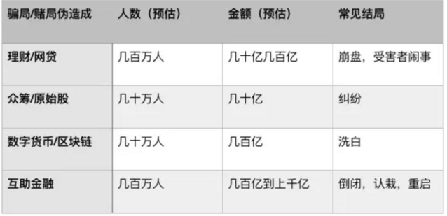 根據(jù)我的了解,我把他們大致分為以下幾類,他們的市場規(guī)模和結局大致如下: 看看網(wǎng)貸的那些崩盤的騙局,e租寶、大大團體,每個都有數(shù)百億規(guī)模,這些崩盤,都造成了巨大的影響。實在我理解后面三種的規(guī)模,都比這個理財崩盤的規(guī)模要大。 為什么騙了還能洗白?由于這些貪婪的受害者不覺得是被騙,認為是賭輸了認栽。炒幣輸了,互助倒了,他們都把原因歸結為命運運限不好,殊不知,背后實質上是被騙了。只要受害者不鬧事,就沒有受害者。【不信你去舉報傳銷嘗嘗就知道了,公安說你找工商,工商問你你是受害者嗎,不是就不要瞎忙活,組織傳銷罪可沒有這么輕易定罪】 這些每個都是有備而來,而且,都有成型的工業(yè)鏈和模式套路支撐。對中國的整個金融秩序,是莫大的傷害。這些每個都利用了投資人逐利和追求暴利的心態(tài)。不可否認,欲求不滿和貪婪是每個人的本能,冷靜節(jié)制才是后天培養(yǎng)的技能。 且截至目前,并沒有看到政府拿出切實可行的策略來應對。甚至在去中央化傳銷等領域的法律基本都仍是空缺。即使被你抓到,你都沒法用現(xiàn)有的法律來進行裁定。沒看到MMM都是公然的搞的嗎,沒看到套著“區(qū)塊鏈、數(shù)字貨泉”外衣的偽幣騙局都公然拉人開大會嗎,由于按照現(xiàn)有法律,人家可能根本沒有違法。 我們能夠制定政策的央行和部委,處在高位,身邊會萃的學者說客,忙著兩眼盯著技術立異國外發(fā)展標榜自己,并不一定看得到這種具有中國特色的規(guī)?膳碌牡讓域_局怪相。出臺的政策方針可能并不能很好的應對這些事情。 理財、網(wǎng)貸騙局因為P2P網(wǎng)貸在前兩年的迅猛發(fā)展催生了這類公司。年底開始泛起大量的跑路崩盤。 這種技術含量低,實施門檻低,易學易用,金向陽,e租寶,大大團體都是典型,倒閉跑路的網(wǎng)貸平臺基本屬于這一類。設立資金池,吸納大量的公家資金進行投資,給投資人高額回報作為誘惑;旧弦粌赡昃蜁簟 他們常見的策略就是上央視廣告、和領導合影、交更多的稅、拿更多的獎、租高大上寫字樓、給優(yōu)厚的待遇、招大量的員工,拼命擴大規(guī)模。以快和大來應對一切泛起的題目。 面向對象基本是大媽大爺。輕微有點互聯(lián)網(wǎng)使用習慣的都不大會上當。 這些公司在爆掉之前,都是地方政府的香餑餑,由于稅多啊。這些公司一而再再而三的倒閉,讓投資人知道,任何廣告都不附帶信用,央視做著騙子廣告也可以免責。只要騙子還沒被法律界定,央視接他們的廣告,忽悠全中國人民,他們是不用承擔責任的,高鐵廣告同理。 這種跑路的理財公司,最后的結局都是爆掉,瘋狂擴張民間借貸的互聯(lián)網(wǎng)加強版。 原始股、股權眾籌騙局你們有沒有朋友圈看到過這樣的廣告,一般都是鮮紅的圖配著亢奮的字,告訴你,暴富機會在面前,再不捉住就沒有了,再不投資就錯過下一個馬云了。
