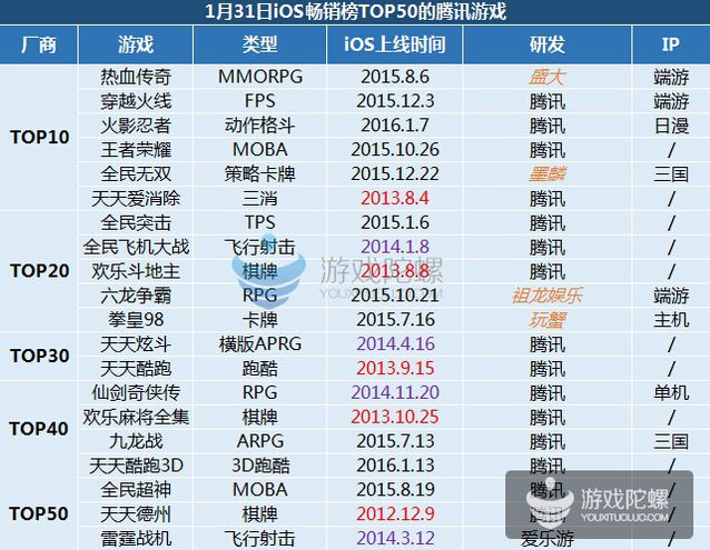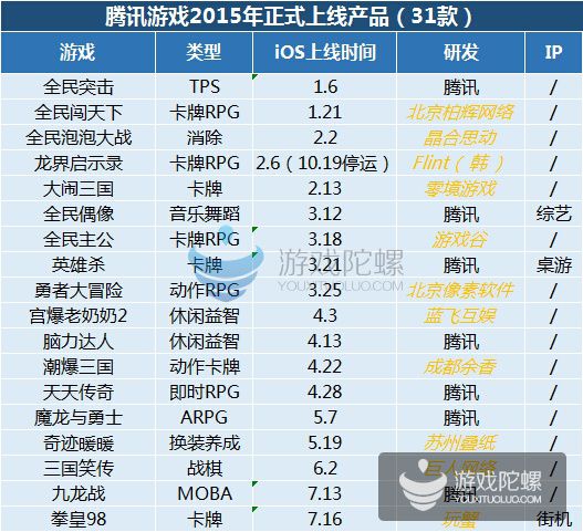 (僅統(tǒng)計2016年1月31日App Store當天暢銷榜,騰訊發(fā)行游戲排名) 實在我們結(jié)合這幾年的騰訊手游發(fā)行情況,騰訊的主要策略仍是獲取用戶為主,由于在之前幾年中渠道擁有很大的上風。騰訊70%的產(chǎn)品都是基于大品類籠蓋,包括跑酷、飛行射擊。但跟著人口紅利上風衰減,用戶不斷成熟,渠道已經(jīng)不能決定用戶選擇游戲的方向,游戲本身的質(zhì)量已經(jīng)越來越重要,越來越多的用戶開始有了明確需求。細分市場,垂直用戶以及精品產(chǎn)品成為了騰訊的基本打法,這一策略也被市場所驗證。不外手游生命周期的題目,依舊困擾著所有從業(yè)者,如何延長?最靠譜的方式仍是MMO,這個被端游、頁游市場驗證過的形式。不光騰訊,2016年所有的大廠都往這個方向靠攏。 2015年騰訊發(fā)行的重點產(chǎn)品已經(jīng)集中在了重度類型,當然騰訊內(nèi)部的分類沒有輕、中、重,而是按類型分,以這個尺度看:卡牌、休閑、MOBA、FPS四類為主。IP類產(chǎn)品在騰訊2015的手游中表現(xiàn)十分凸起。但顯然騰訊還有大量的IP產(chǎn)品和來自合作CP的產(chǎn)品。