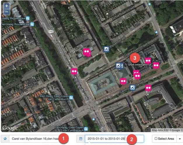 在這個(gè)例子中,我鍵入了殼牌總部的地址(1)但愿找到特定時(shí)間(2)內(nèi)在那里工作的人(3)發(fā)布的信息。