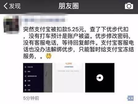 這條朋友圈的大概內(nèi)容就是,他的優(yōu)步賬號被盜刷了,而且,除了凍結(jié)支付寶,一點(diǎn)辦法也沒有。。。 當(dāng)然,這有可能是個個例。