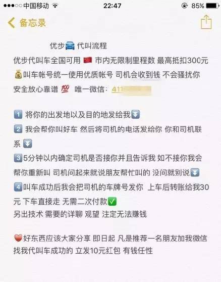 也就是說,他利用一個盜取的賬號幫你叫車,無論路程多遠(yuǎn),你只需要暗里給他 30 元,就可以拍拍屁股走人了。。而實(shí)際打車用度,就由那些被盜號的人承擔(dān)了。。。 上圖還特么宣傳了可以教你,這樣的技術(shù): 另出技術(shù),需要的詳聊,觀望,注定無法賺錢。 好東西應(yīng)該大家分享,即日起,凡是推薦一名朋友加我微信找我代叫車成功的,立發(fā) 10 元紅包,有錢率性。 (踏馬的,有錢還干這種齷齪事??)