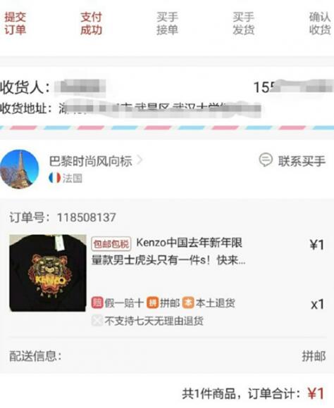 一件kenzo衛(wèi)衣讓武漢的陳同學(xué)(化名)走上了維權(quán)的道路。