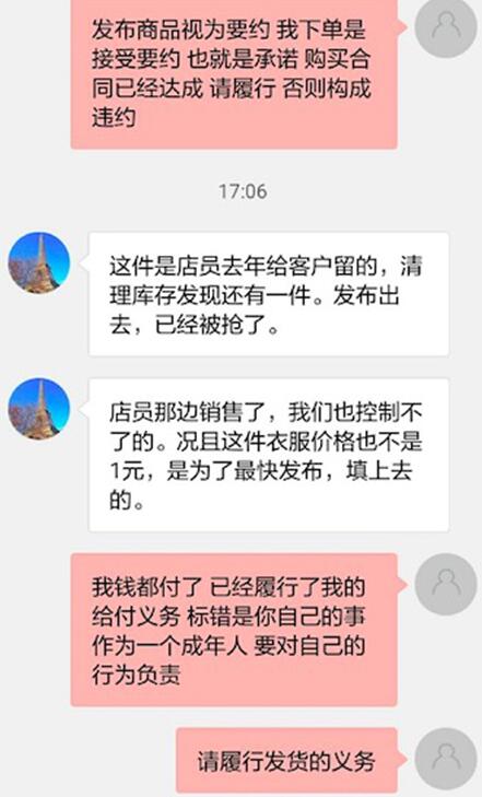 當(dāng)天1元搶購成功后,陳同學(xué)很快收到了巴黎時(shí)尚風(fēng)向標(biāo)店鋪發(fā)來的動(dòng)靜,賣家表示商品已經(jīng)賣出無法給陳同學(xué)發(fā)貨,同時(shí)表示,這件衣服的價(jià)格并不是1元,是為了最快發(fā)布才填上去的。
