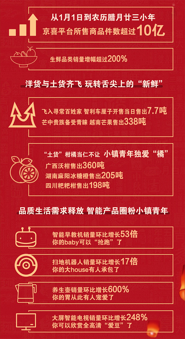 年味漸濃,我們的年貨都準(zhǔn)備的怎么樣了?京喜發(fā)布了2020年貨節(jié)期間的數(shù)據(jù):1月1日至1月17日小年期間,京喜渠道累計出售產(chǎn)品件數(shù)超過10億:作為年貨剛需品的生鮮品類銷量增幅環(huán)比超過200%,