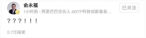 就在楊偉東的新聞爆出后,外界發(fā)現(xiàn)前阿里巴巴集團(tuán)大文娛董事長(zhǎng)俞永福發(fā)了一個(gè)狀態(tài),一個(gè)字沒寫,只有三個(gè)問號(hào)和三個(gè)感嘆號(hào)。