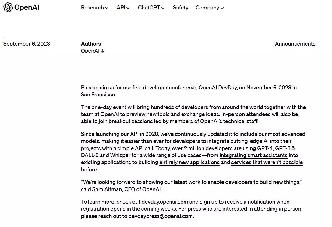 9月7日電 當?shù)貢r間6日,美國人工智能公司OpenAI在官網(wǎng)發(fā)布公告稱,將于11月6日在舊金山舉辦公司的首屆開發(fā)者大會。 公告介紹,