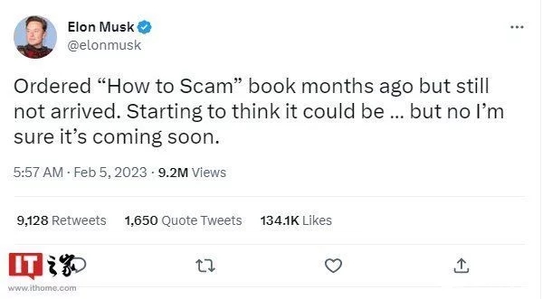 馬斯克發(fā)今日推文稱:“在幾個(gè)月前訂購了一本叫做《怎么欺詐》的書,但還沒到,開始覺得它可能是... 不,我相信它很快就會(huì)到了!
