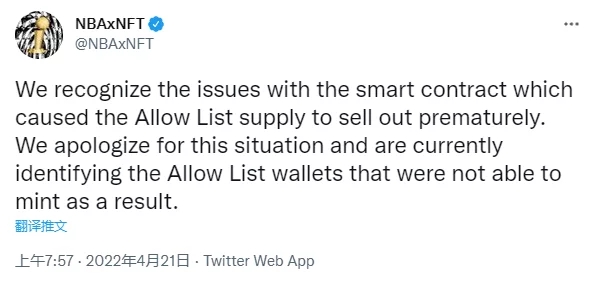 4月21日音訊,美國(guó)國(guó)家籃球協(xié)會(huì)(NBA)旗下NBAxNFT官推特發(fā)文稱:“咱們認(rèn)識(shí)到智能合約的問(wèn)題,它導(dǎo)致白名單供應(yīng)提早售罄。目前正在識(shí)別白名單中無(wú)法鑄造NFT的錢包!