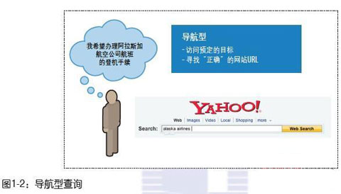 1.4.1 導(dǎo)航型查詢 導(dǎo)航型查詢的目的是直接閱讀某個特定的網(wǎng)站。在某些情況下,用戶可能不知道準(zhǔn)確的URL,查找引擎這時起到電話號碼簿的效果。