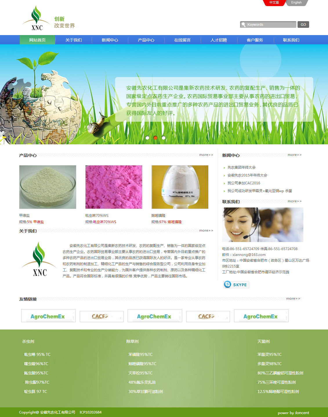 安徽先農(nóng)化工有限公司是集新農(nóng)藥技術(shù)研發(fā)、農(nóng)藥的復(fù)配生產(chǎn)、銷(xiāo)售為一體的國(guó)家級(jí)定點(diǎn)農(nóng)藥生產(chǎn)企業(yè)。農(nóng)藥國(guó)際貿(mào)易事業(yè)部主要從事農(nóng)藥的進(jìn)出口貿(mào)易,專營(yíng)國(guó)內(nèi)外目前重點(diǎn)推廣的多種農(nóng)藥產(chǎn)品的進(jìn)出口貿(mào)易業(yè)務(wù),其優(yōu)良的品質(zhì)已獲得國(guó)際友人的好評(píng)。是一家專業(yè)從事農(nóng)藥和農(nóng)藥制劑的制造加工、精細(xì)化工產(chǎn)品的生產(chǎn)與銷(xiāo)售的綜合服務(wù)型公司